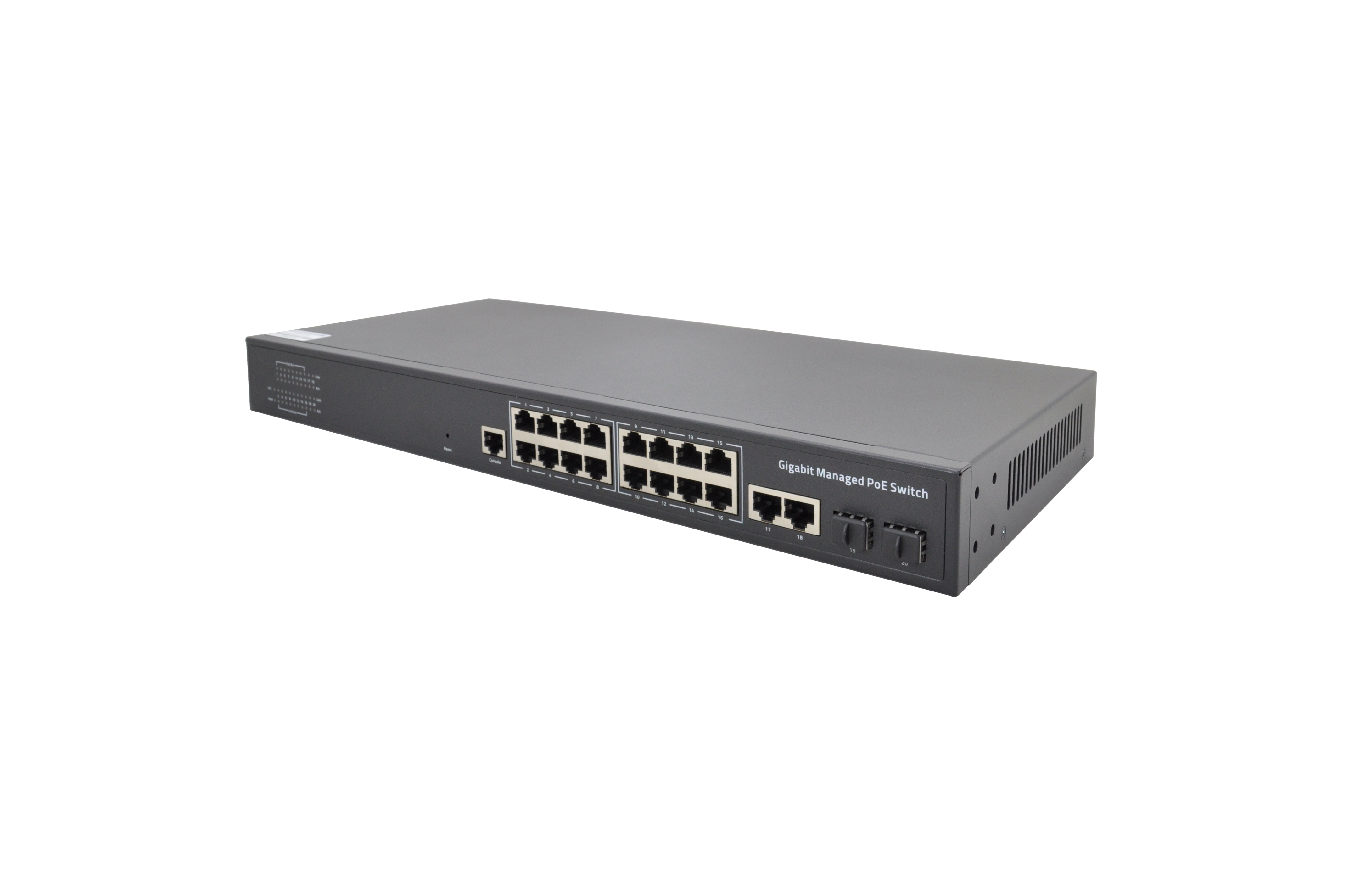 | Ethernet | 16 Port 10/100/1000Mbps PoE + 2 Port 10/100/1000Mbps Uplink + 2 Port 1000Mbps SFP + 1 Port RJ45 Console |